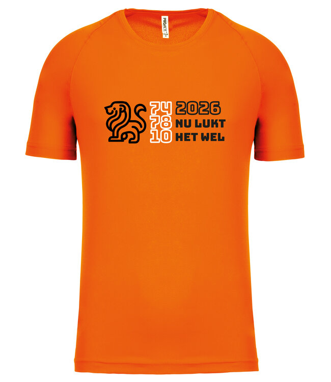 Fanshirt Oranje met tekst "2026 nu lukt het wel" | Sportshirt Uni versie in kleur Fluo-Oranje